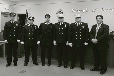 At the annual reorganization meeting of the Borough of Beachwood, the 2019 line officers of the fire department were officially sworn in. This year's officers are Chief Roger Hull, Assistant Chief Dennis Allen, Captain William Hopson and Lieutenants Kevin Davison and Joseph Gugger. Mayor Ronald Roma administered the oath to the Line Officers.